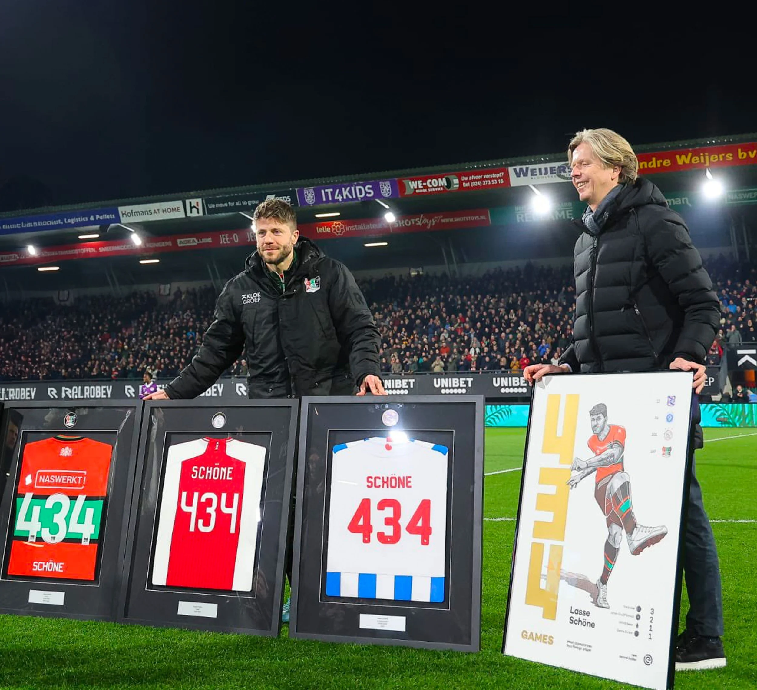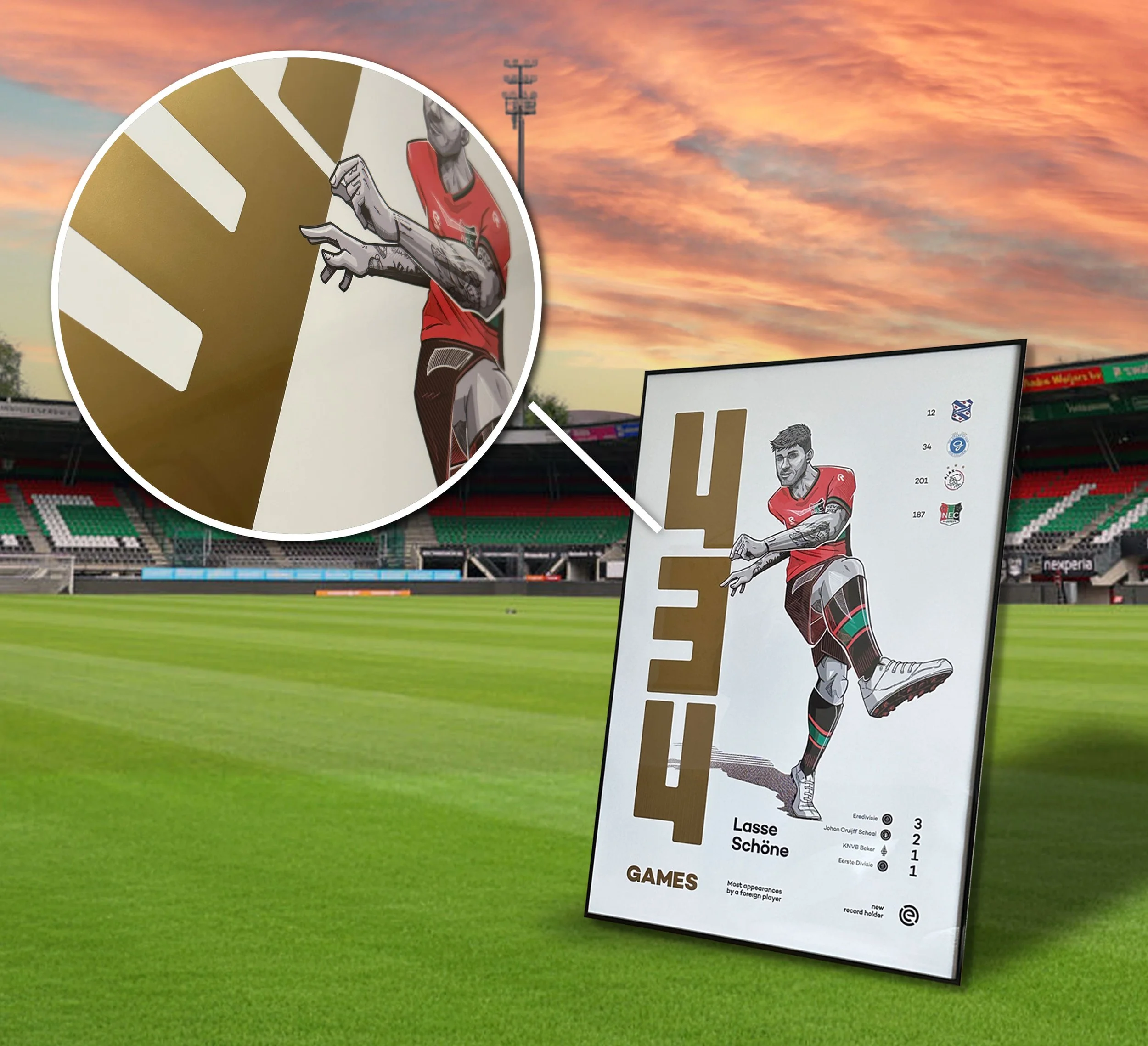 Voor de KNVB mocht ik een bijzondere poster realiseren ter ere van Lasse Schöne, die het record brak als buitenlandse speler met de meeste Eredivisiewedstrijden. Het ontwerp werd aangeleverd door Graphic Hunters, en mijn opdracht was om ervoor te zorgen dat het goud in de poster écht goud zou lijken – een detail dat de exclusiviteit en waarde van de prestatie benadrukt.