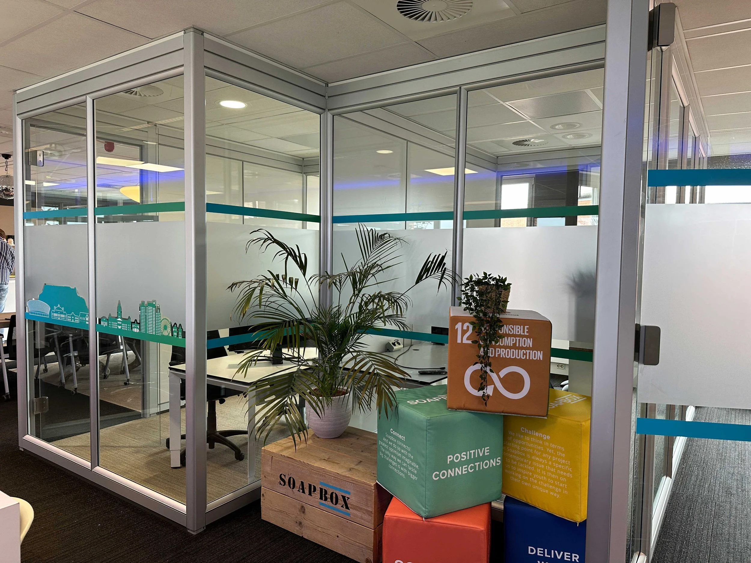 Een van de grootste uitdagingen in het nieuwe kantoor was privacy. Veel vergaderruimtes waren volledig van glas of bevonden zich midden in de open werkruimte, waardoor er weinig afscherming was en medewerkers zich bekeken voelden. Soapbox wilde een oplossing die zowel privacy creëerde als bijdroeg aan de branding en uitstraling van het kantoor.